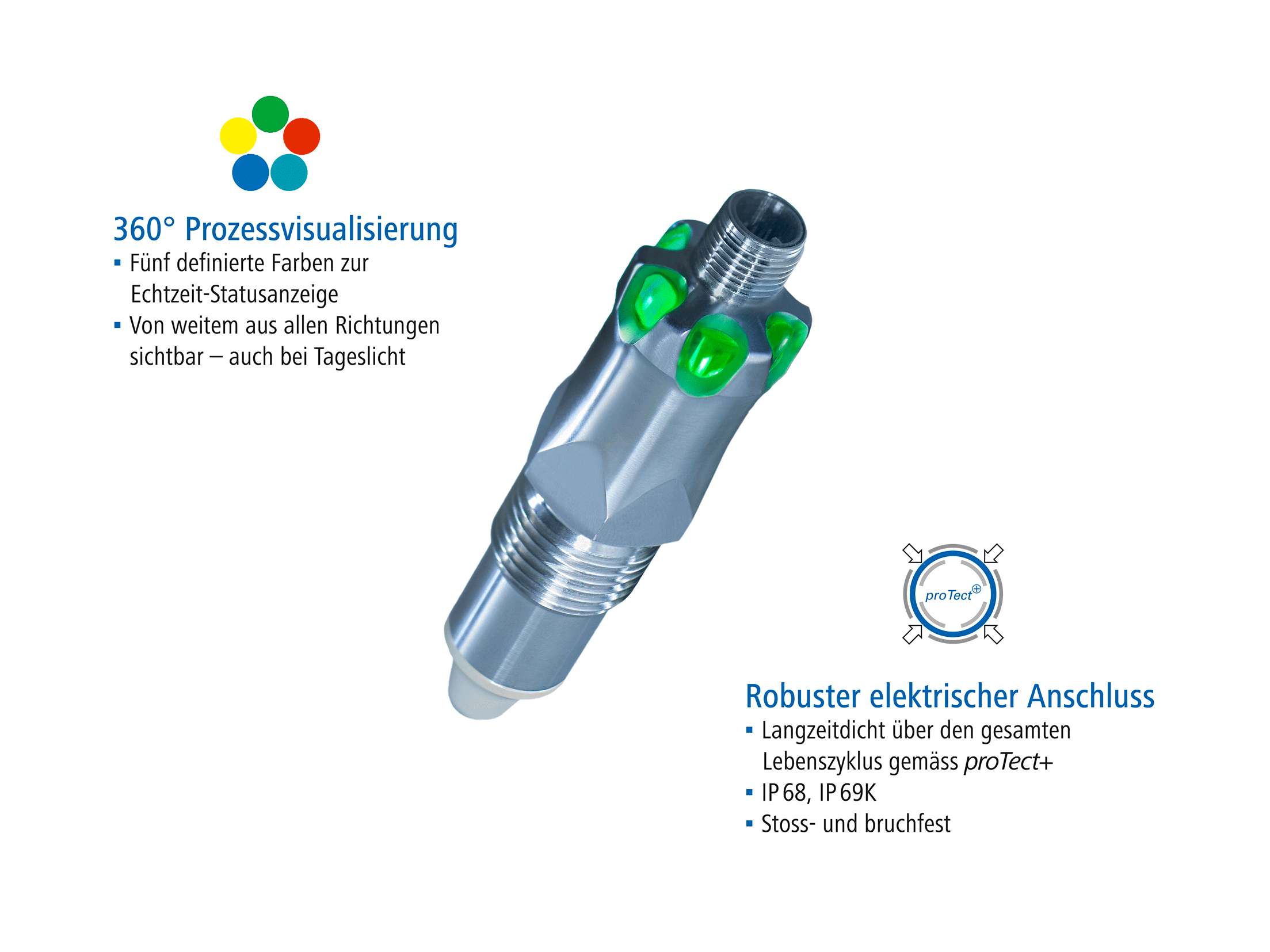 During the level measurement with the CleverLevel PL20, five defined colours indicate whether the level has been reached, what medium is in the tank, or if there is a malfunction. Thanks to the 360° LEDs, this information is visible from all locations all the time, allowing reliable processes.