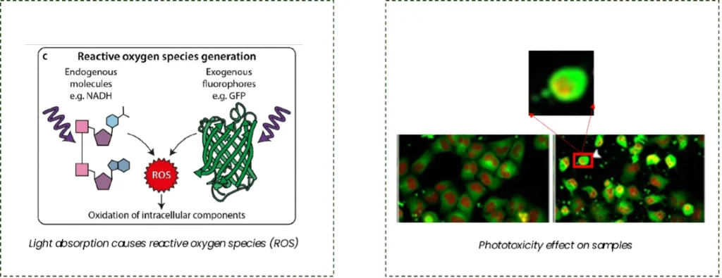 Live imaging of samples is done with fluorescence microscopy. This mechanism uses string lights to excite the fluorophores. When live cells or specimens are exposed to this strong light for a long time, it may affect the metabolism by impairing sample physiology and even lead to sample death. This is caused by organic molecules present in the sample that absorb light at visible wavelengths and react with oxygen. An oxidised sample molecules become non-functional.