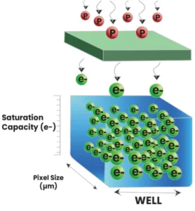 The electrons generated from photons during exposure are collected in the wells (Figure 1). The maximum number of electrons the pixel can hold is determined by the full well capacity/saturation capacity. The bigger the pixel, the higher the saturation capacity. This also characterises the sensor’s dynamic range. If the generated charge exceeds the full capacity of a pixel during the exposure time, the extra charges tend to flow to the neighbouring pixels. This results in blooming.
