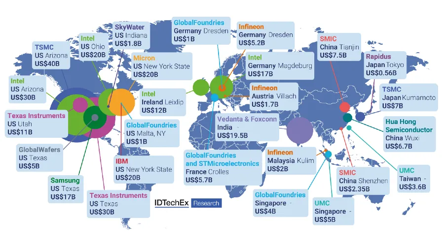 Shown here are the proposed and confirmed investments into semiconductor facilities by manufacturers since 2021. Where currencies have been listed in anything but US$, these have been converted to US$ as of May 2023. Source: “AI Chips: 2023–2033”, IDTechEx