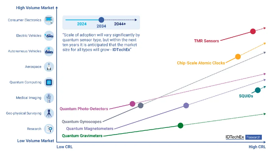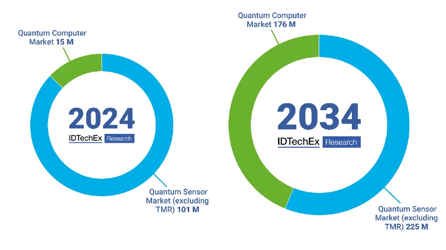 Overall, while the value of quantum computer hardware will remain high (in some instances, millions of dollars per system), the high-volume markets for quantum sensors are expected to give this category the edge in market size for the next ten years. Even excluding tunneling magneto resistance (TMR) sensors, which have been rapidly adopted for remote current sensing within electric vehicles, by 2024 IDTechEx forecasts the quantum sensor market will generate more than six times the revenue of quantum computing hardware.