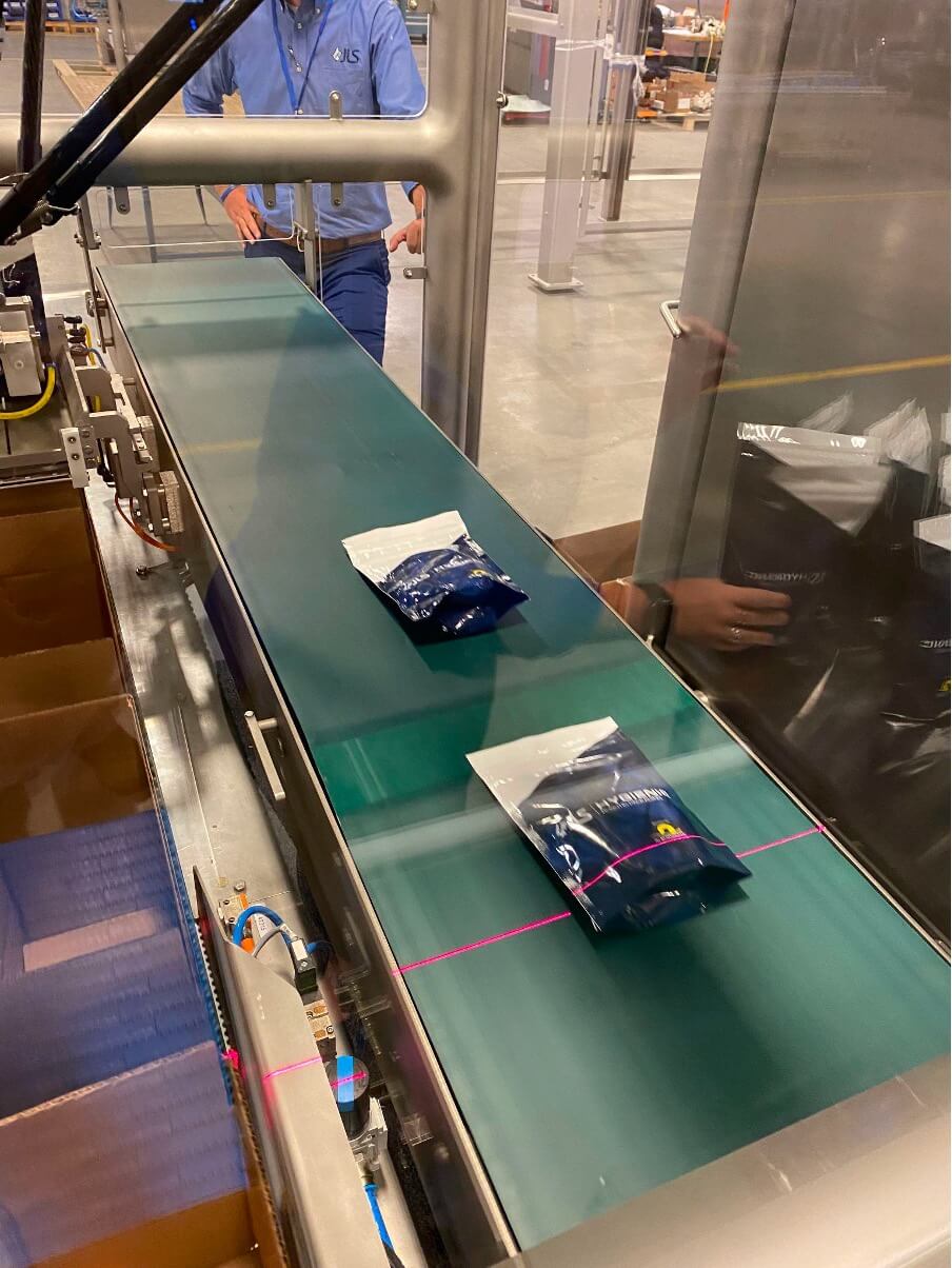One of their common systems for chub case packing required changing parts to control the background colour to deal with the wide range of package graphics. This change part is now eliminated. Another system handles stand-up pouches. The profile of these packages obtained with a 2D camera does not provide information on which end of the package is at the bottom.