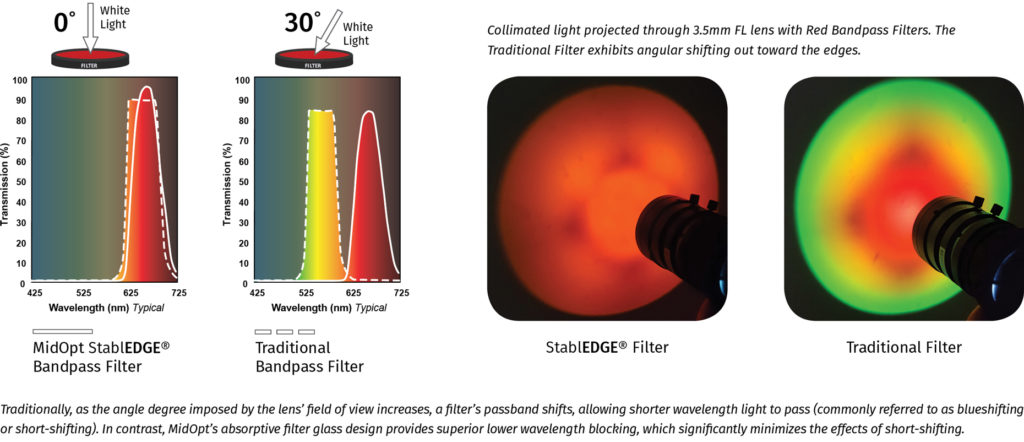 Using a traditional coated interference filter in these more compressed configurations results in contrast loss toward the edges of the image. Because of the angle imposed by the field of view (FOV) of the lens, the passband shifts and allows short wavelength ambient light to overwhelm the subject. Light from LED or laser diode lighting is also cut off. In contrast, peak transmission of MidOpt StablEDGE® filters is not significantly altered, and effects due to short shifting are minimized.