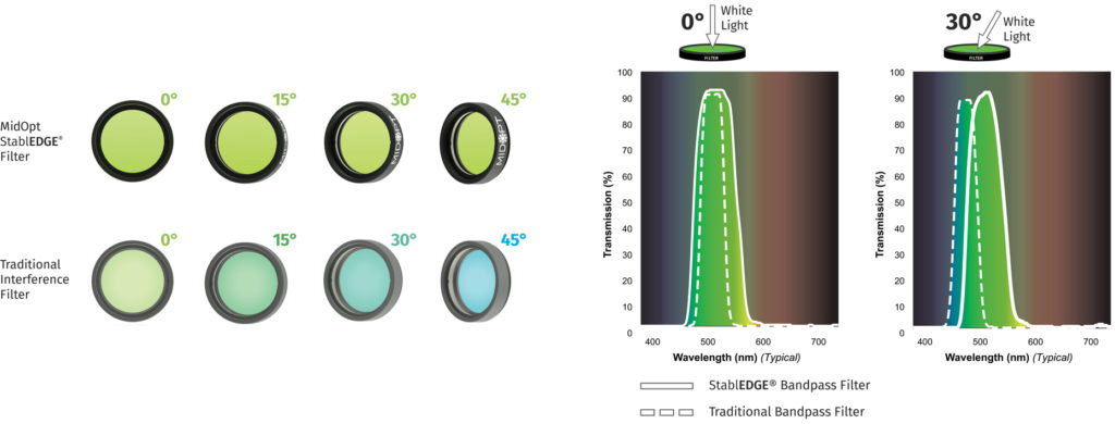 MidOpt StablEDGE® filter cut-off slopes utilize interference filter coatings; however, the cut-off slope is positioned to be sufficiently broad, and the Gaussian passband profile ensures that excessive ambient light is not allowed to degrade image contrast. Thus, shifting will not significantly encroach into peak transmission, assuring angular insensitivity over the desired range.
