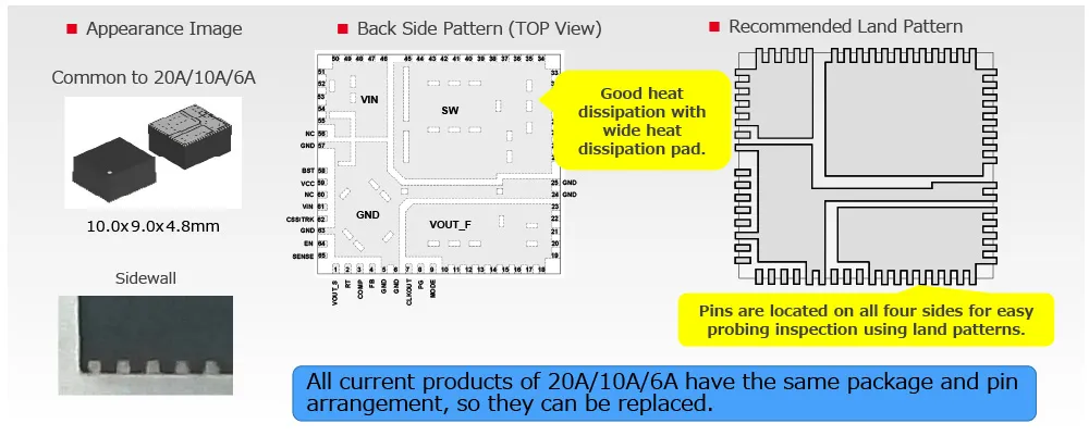 Since these products use a QFN package with pins on all four sides, unlike LGA or BGA-type packages with pins on the bottom, a probing inspection can be easily performed by using land patterns without creating another board or making special test pads for probing inspection. In addition, three variations of the maximum current are available. Since these products share the same package and pin layout, they can be easily replaced even if the maximum current specification needs to be changed during the design process.
