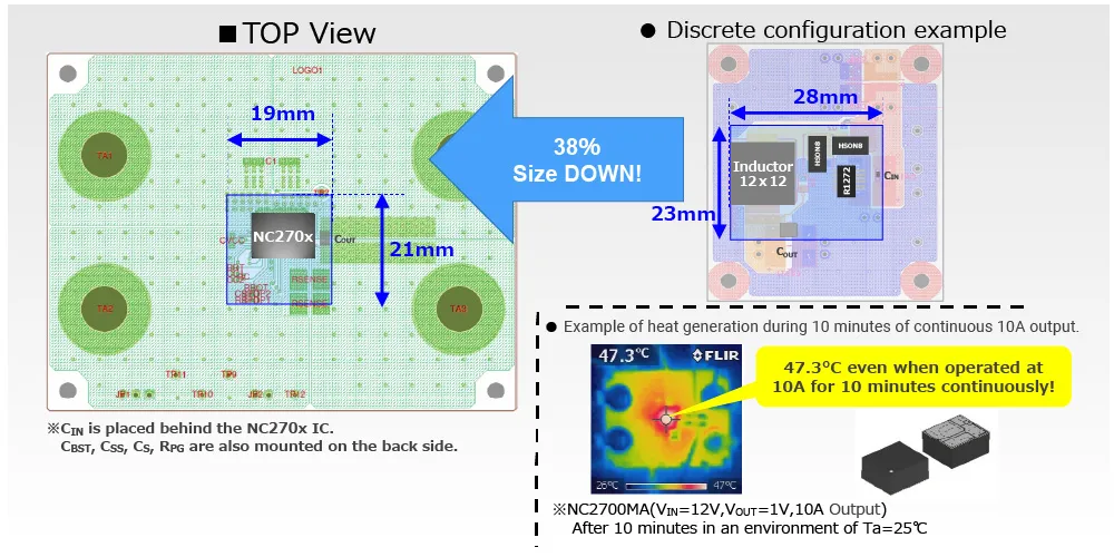 In DC/DC board design, recommended pattern diagrams may be provided to prevent oscillation. Still, in many cases, the recommended patterns cannot be used due to limitations in the application board area. Including the inductor, FETs and bypass capacitor (for noise reduction) in a single package, these modules enable easy board design of power supply circuits up to 20 A by simply placing input and output capacitors and other components next to these products. In addition, these products have excellent heat dissipation by adopting a high heat dissipation package. Achieve up to 20 A Output Current with Simple Board Design Thanks to the Modularisation.
