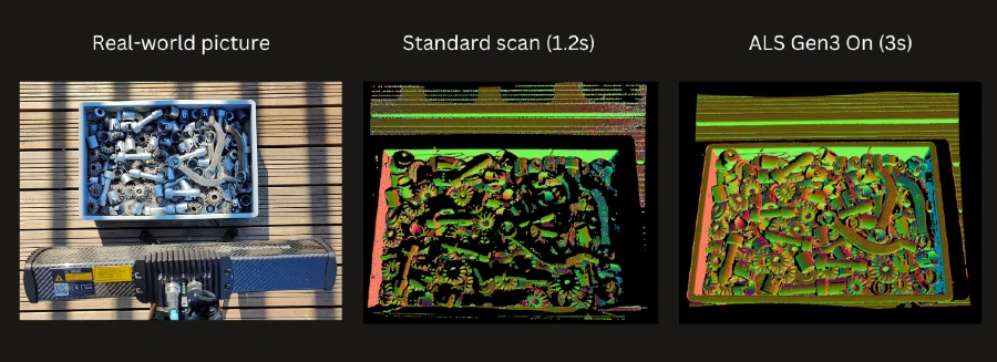 In addition, ALS Gen3 ensures stable scanning performance in environments with varying lighting conditions caused by the changing intensity of light coming to the room through windows, roof windows, skylights, and other light sources. Therefore, the technology can also effectively deal with shadows – a common challenge in bin picking applications.