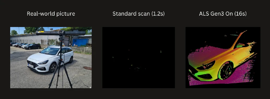 ALS Gen3 uses a special acquisition method that actively suppresses the effects of direct sunlight without increasing the intensity of light coming from the scanner projector. Thanks to the ability to suppress strong light sources while not harming low-light areas of the scan, the technology can also provide very high dynamic ranges.