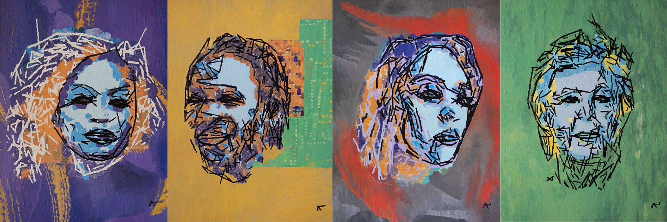 From L-R: Ai-Da Robot’s portraits of Diana Ross, Kendrick Lamar Billie Eilish, and Paul McCartney will be on sale in the ShangrilART gallery at this year’s Glastonbury Festival